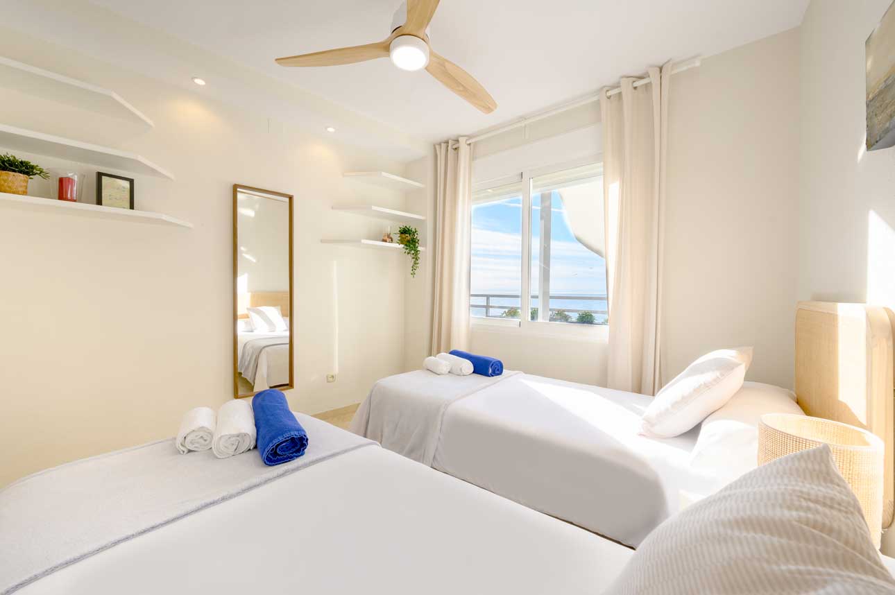 On this floor you’ll find two bedrooms: a triple bedroom with views of the mountains, and a room with two single beds and a large window with stunning south-facing sea views.